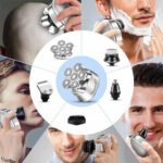1 5-in-1 Shaver, rotating blade heads, cleaning head/brush, smoothing head, USB charger, mini brush for cleaning, and a manual to use.