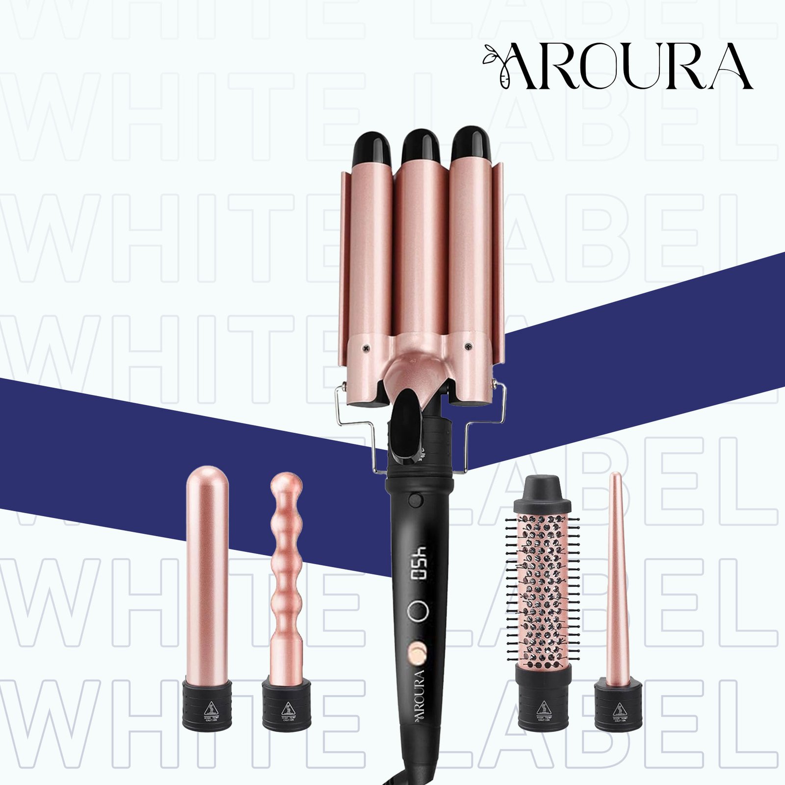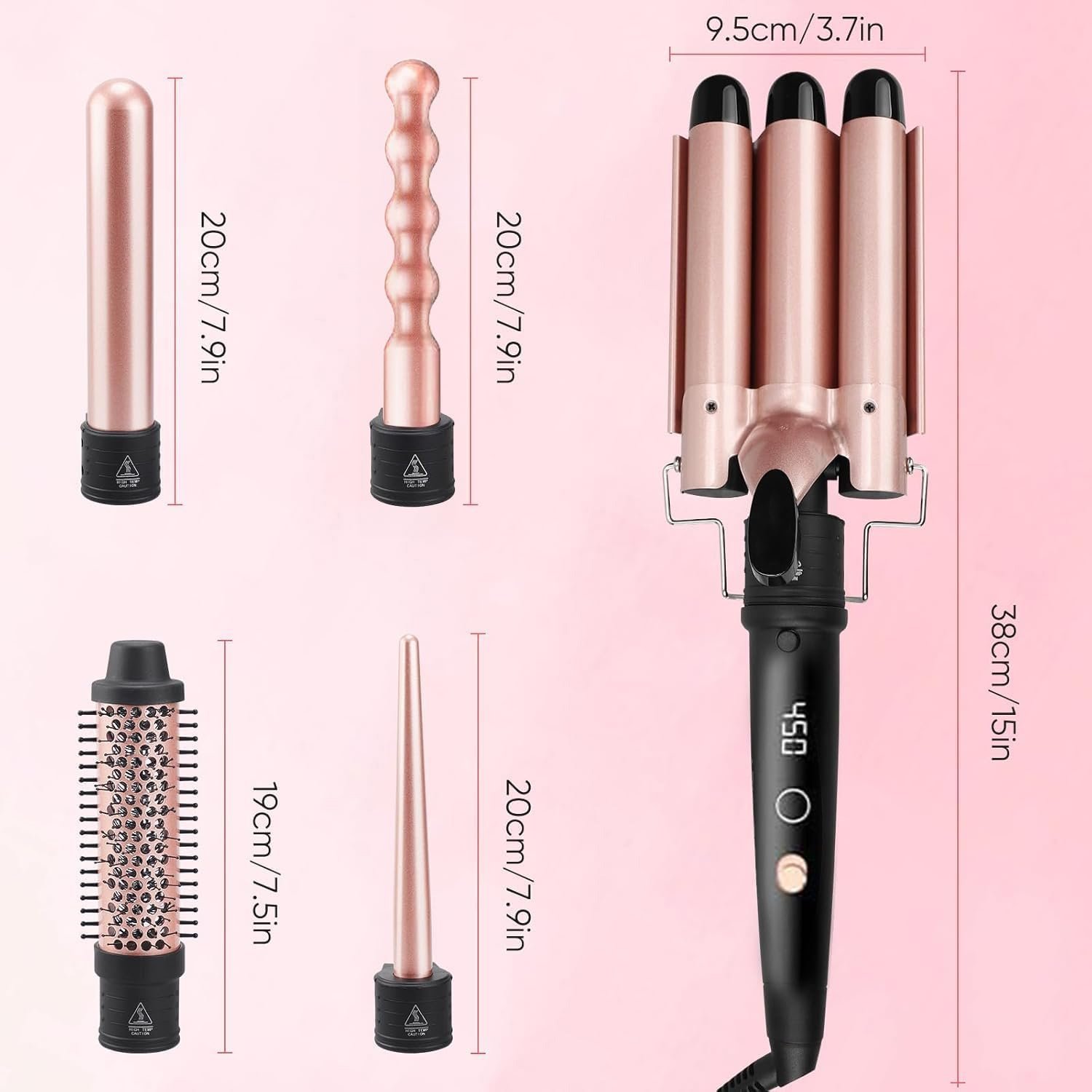 1 curling stick, 5 ceramic heads of different sizes, 1 heat-resistant glove, 2 hair clips for splitting, and 1 instruction booklet.