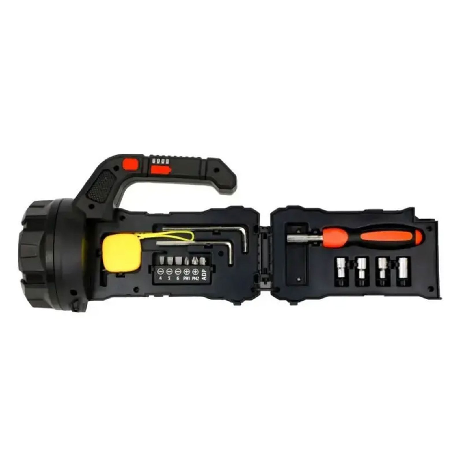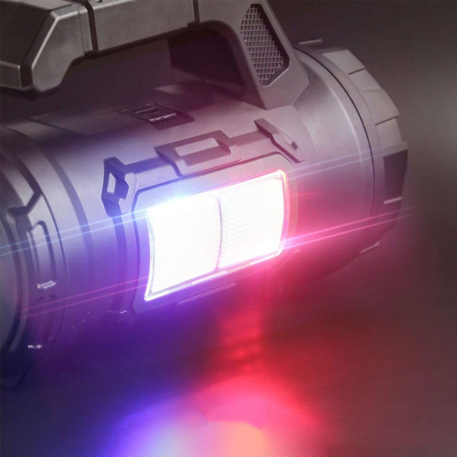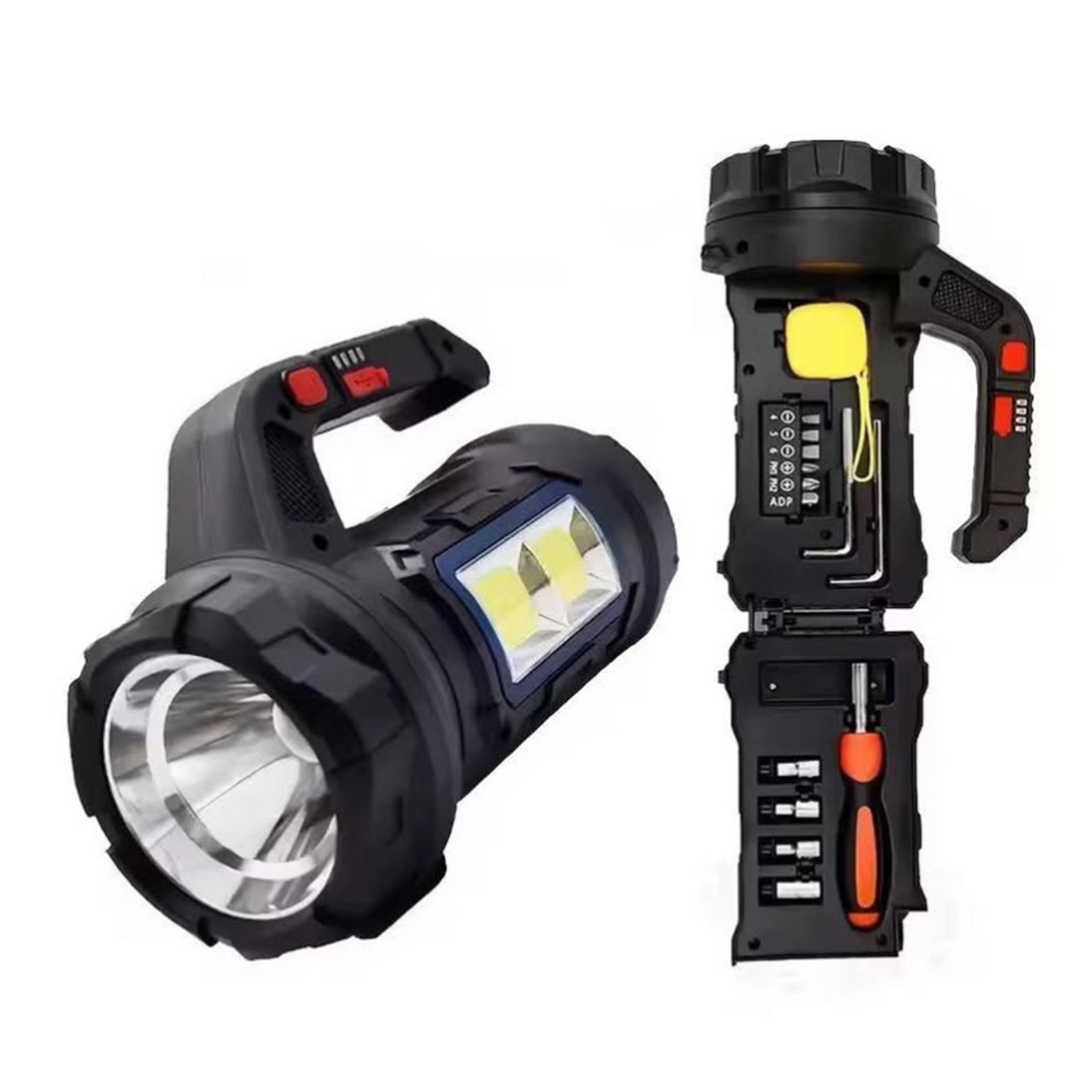 The CreaTeck lamp (model HM-7729G) provides high performance and reliability in various weather conditions. This practical and robust design combines luminaire function with basic repair tools, making it ideal for use at home, trips, or in emergency situations. The T6 LED headlamp gives you high focus, while the cob lighting ensures wide coverage of large areas. The powerful 3.7 V battery with a capacity of 2400mAh guarantees an operating time of 5-10 hours, and is charged at a speed of two to three hours via the USB Type-C port. The material used is shock-resistant ABS, and the product is ready for use directly from the package.