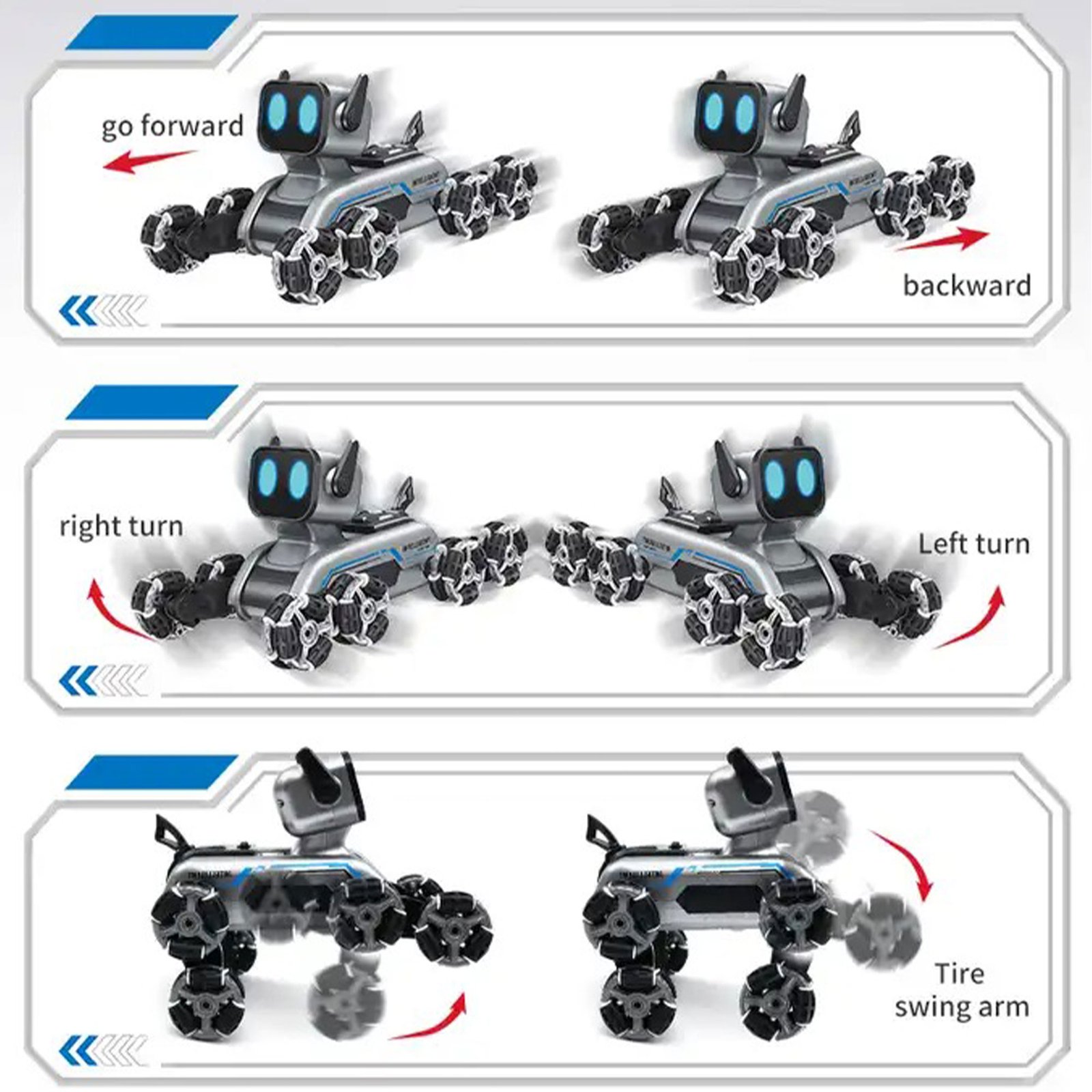Are you looking for a remote control game that goes beyond the limits of normal roads Robot car $\text{RC}$ Smart ones Specially designed for acrobatic and challenging movements, it is capable of Walking and crawling And overcome obstacles with high flexibility, including Climb the stairs without any problem.