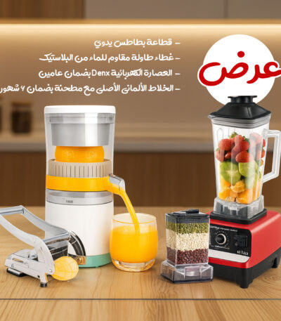 باكج مطبخ متكامل 4×1: خلاط Silver Crest (4500 واط، 35000 RPM) + عصارة Denx لاسلكية (45 واط) + قطّاعة بطاطس شفرتين + غطاء طاولة شفاف 100×80 سم – جودة وضمانات متنوعة