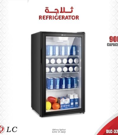 ثلاجة مشروبات DLC (90 لتر) – طراز DLC-32490B، باب زجاجي أسود أنيق، تصميم موفّر للطاقة، رفوف قابلة للتعديل، وقوف حر (46×51×86 سم)، ضمان عامين