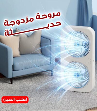 مروحة مزدوجة محمولة قابلة للشحن (5 واط) – 3 سرعات، ريش حلزونية لتوزيع قوي، شحن Type-C سريع، استخدام صامت (هادئ)، تثبيت على الطاولة أو الجدار، مثالية للسفر والمخيمات، ضمان 14 يوم