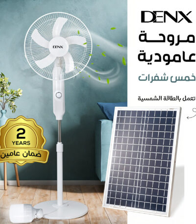 مروحة عامودية شمسية DENX (16 بوصة) – بطارية 5000mAh، تشغيل 4.5 ساعات، 3 سرعات، شحن Type-C (2-3 س)، مصباح LED مدمج، للبر والطوارئ، ضمان عامين (وكيل دينيكس)