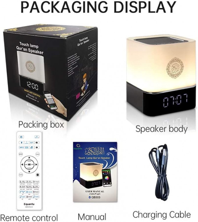 الإضاءة المتعددة: المصباح مزود بـ 7 ألوان مختلفة، مع إمكانية استخدام الإضاءة بدون تشغيل الصوت والعكس صحيح (سماع القرآن الكريم بدون إضاءة).