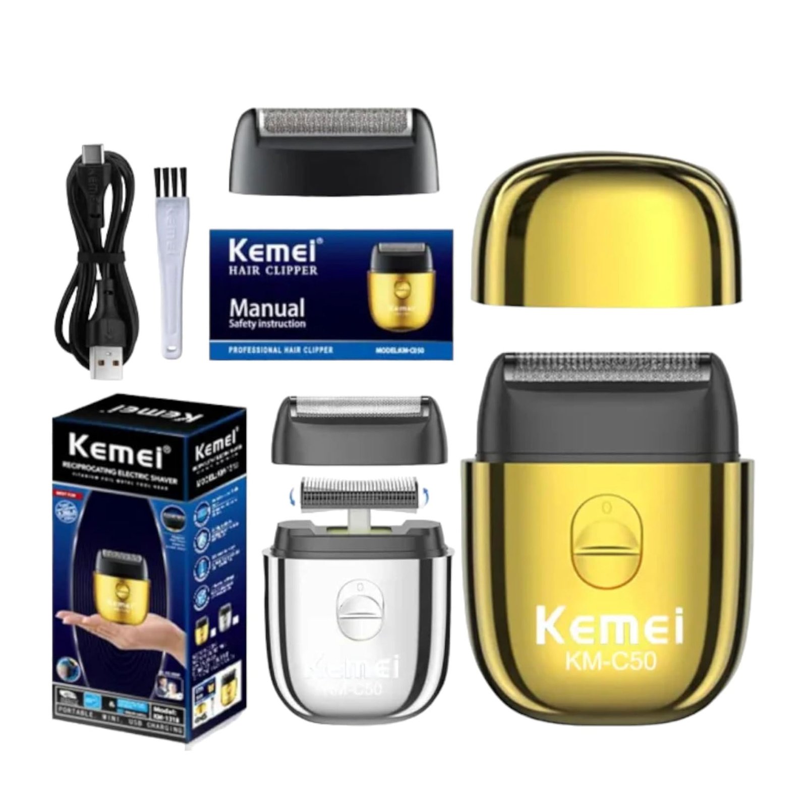 تتضمن العبوة 1 ماكينة حلاقة كيمي KM-C50، 3 أمشاط بأحجام مختلفة ($3/6/10 \text{ مم}$)، 1 مشذب للأنف والأذن، 1 وصلة شحن USB، و 1 دليل استخدام.