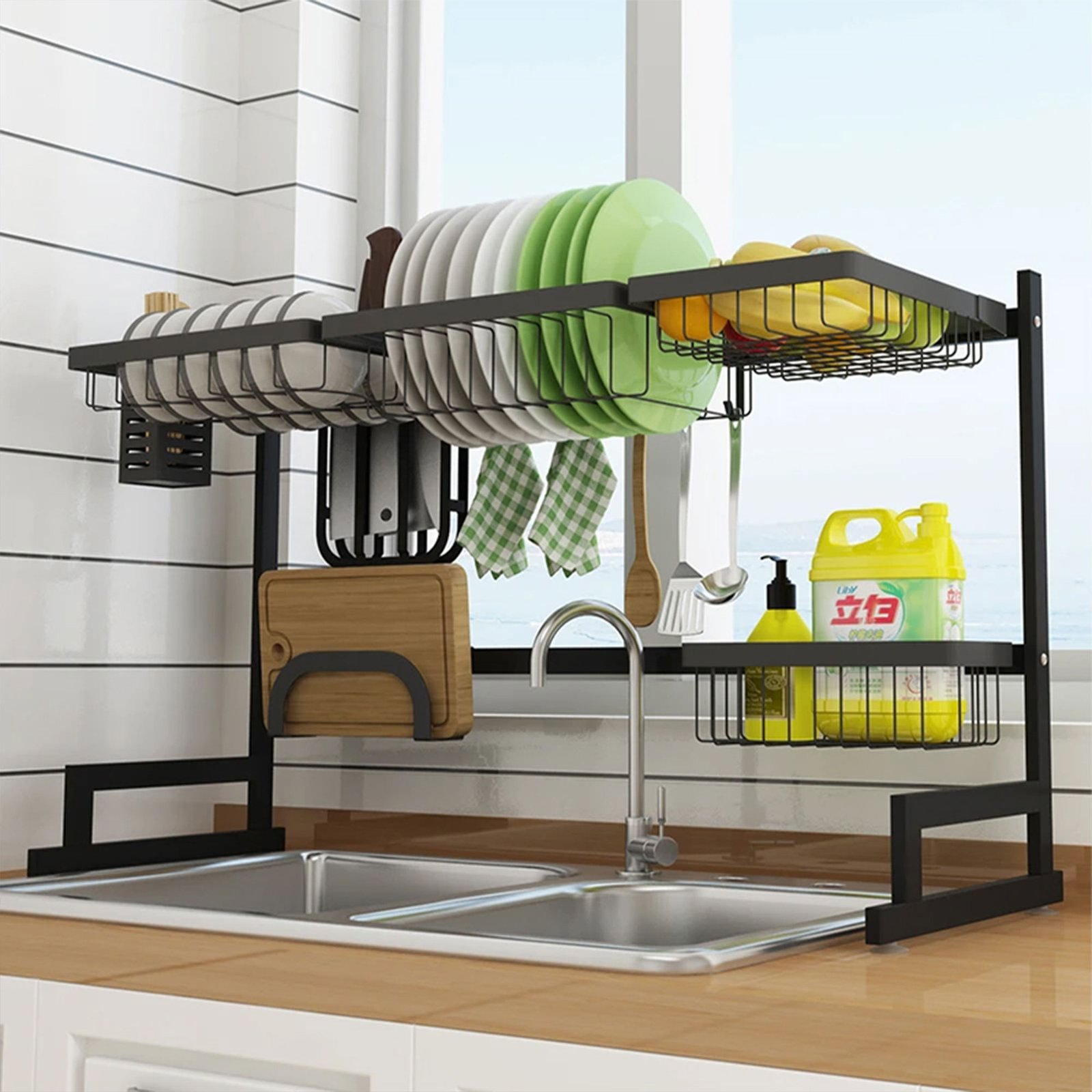 نظّم مطبخك بالكامل فوق الحوض! ✨ منظم الصحون المصنوع من الفولاذ المقاوم للصدأ باللون الأسود هو حل شامل لجميع أدواتك. يتميز بكونه قابلاً لتعديل المقاس ليناسب جميع الأحواض، ويحتوي على رفوف متكاملة للصحون والأكواب والسكاكين والخضروات.