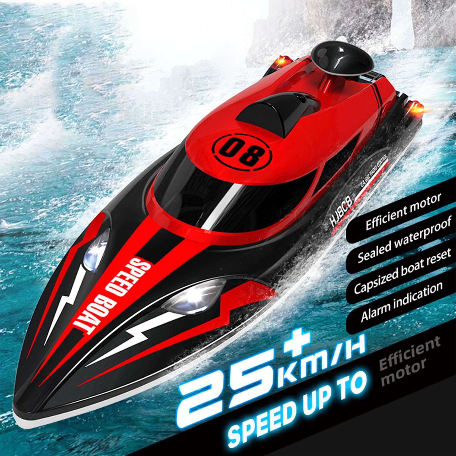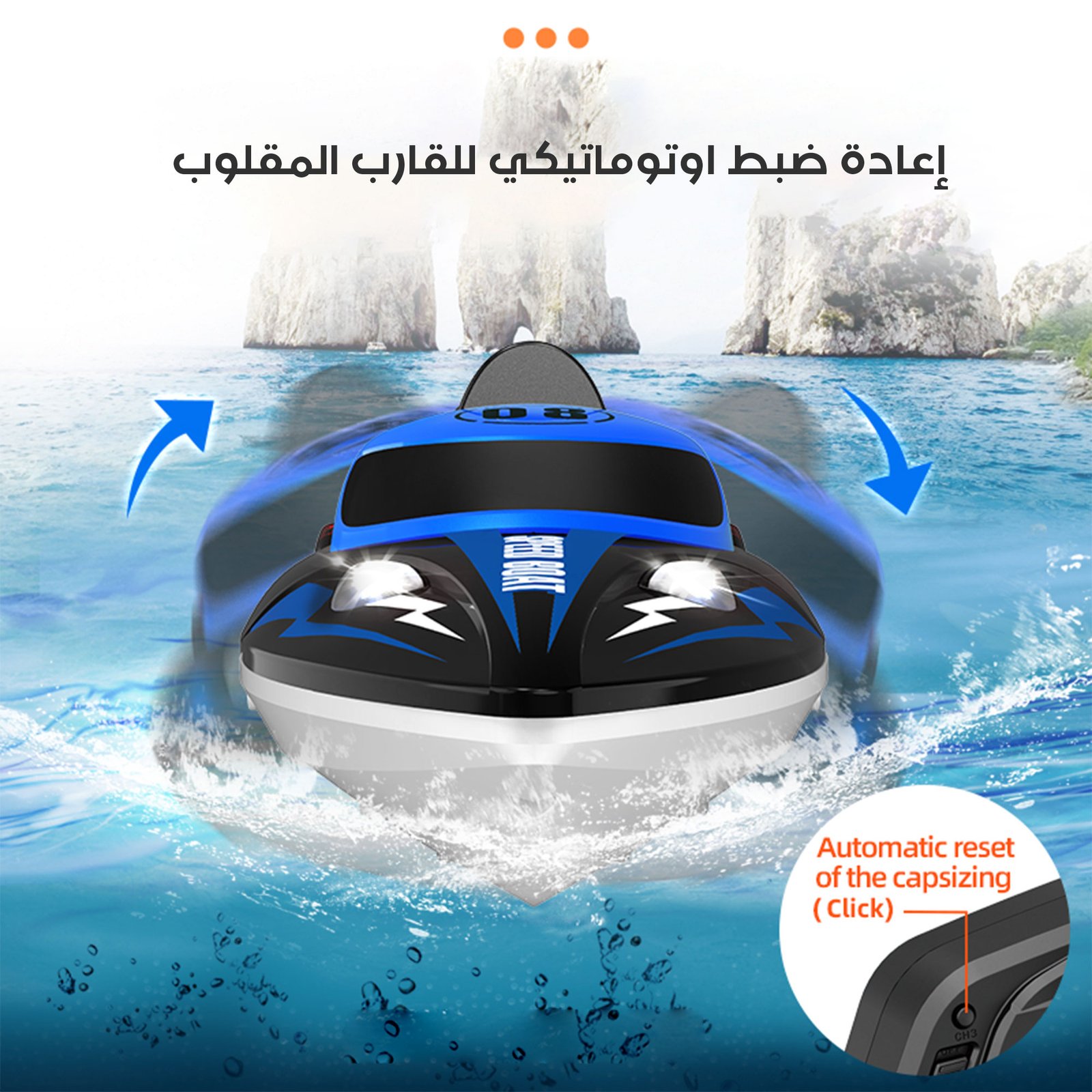 قارب HJ808 مصمم لمتعة المنافسات البحرية، حيث يوفر تحكماً دقيقاً عبر تردد 2.4GHz مما يجعله مناسباً للمنافسات بدون تداخل. يعمل القارب ببطارية ليثيوم 7.4V – 1100mAh، وتصل مدة تشغيله إلى 12 دقيقة تقريباً. يتمتع بميزات أمان عالية تشمل حماية ضد الصدمات من الأمام، وقدرة على تعديل وضعه تلقائياً إذا انقلب. يمكن تشغيل إضاءة أمامية وخلفية لإضافة جو حماسي للمنافسة ليلاً. يتم التحكم في القارب بالوظائف الأساسية: أمام، خلف، يمين، يسار.